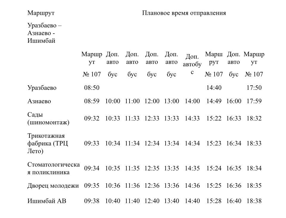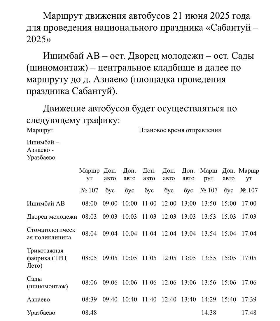 Для удобства гостей составлен график движения автобусов. Доехать до Азнаево можно будет как на маршрутке №107, так и на дополнительных автобусах и микроавтобусах, которые будут курсировать с 8:50 утра до 14:00 из Ишимбая, а также в обратном направлении с 14:40 до 18:38.