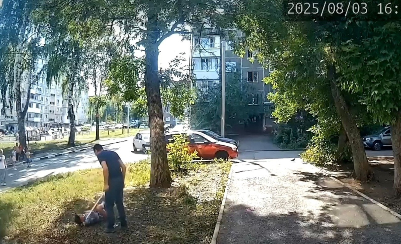 По видеозаписи домофона видно, как мужчина внезапно срывается с места и бежит навстречу мальчику. Догнав, он бьёт ребёнка ногой, а после падения мальчика на траву, несколько раз ударяет его палкой.