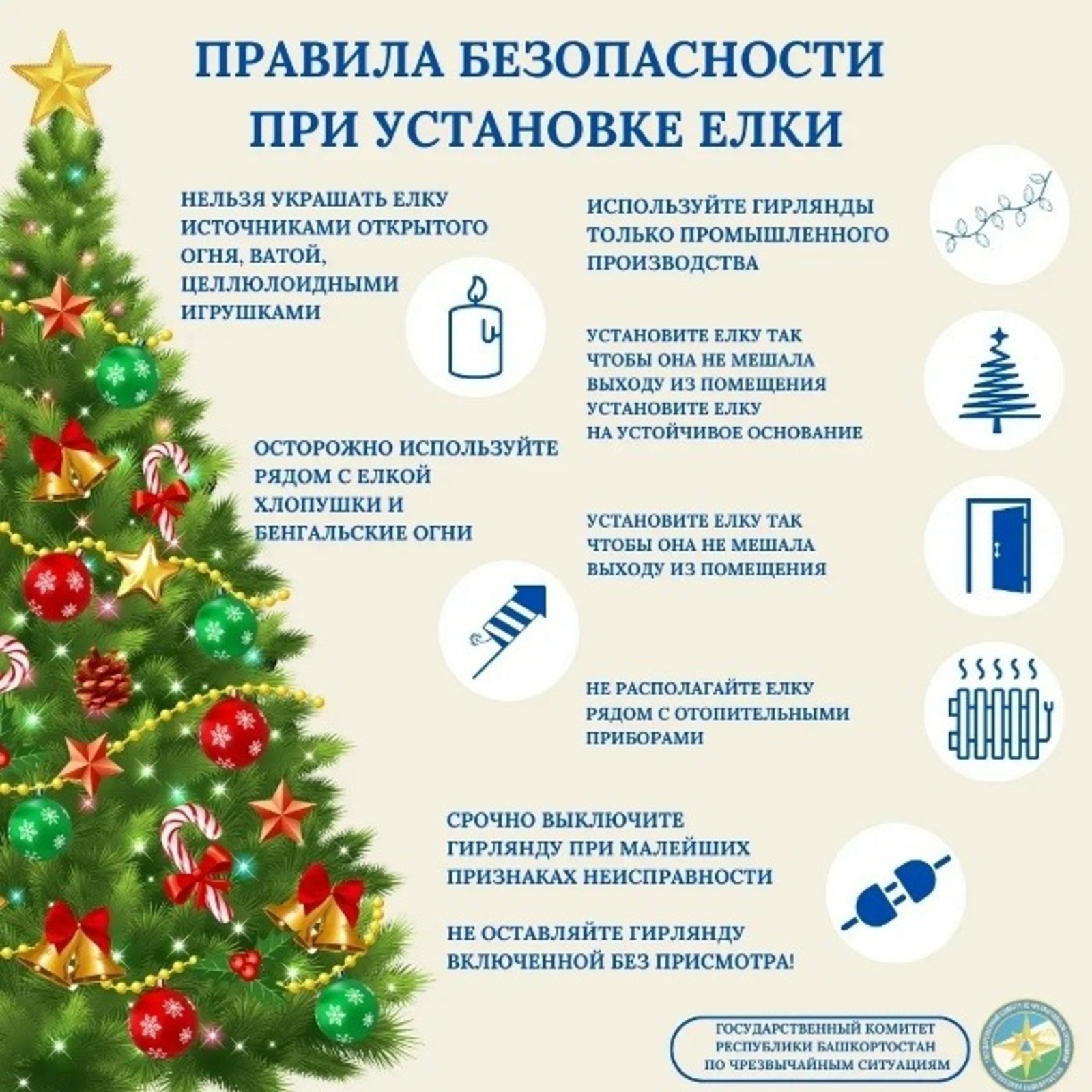 Многие ишимбайцы приступили к установке ёлки или собираются приступить в ближайшие дни. Чтобы веселье не омрачилось неприятностями, Госкомитет Республики Башкортостан по чрезвычайным ситуациям подготовил простой, но важный список правил безопасности.