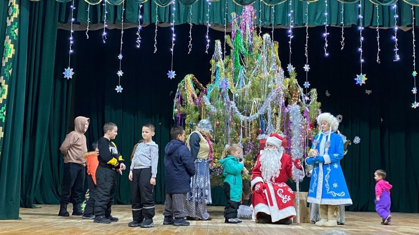 Благотворительная встреча продолжилась в Доме культуры села Петровского. Формат остался прежним – без массовости, но с акцентом на живое общение. Дети участвовали в играх и получили важную поддержку, которую невозможно измерить количеством зрителей или масштабом сцены. Местные артисты порадовали зрителей театрализованным представлением, создавая атмосферу новогоднего волшебства. А Дед Мороз и Снегурочка всем раздали сладкие подарки.