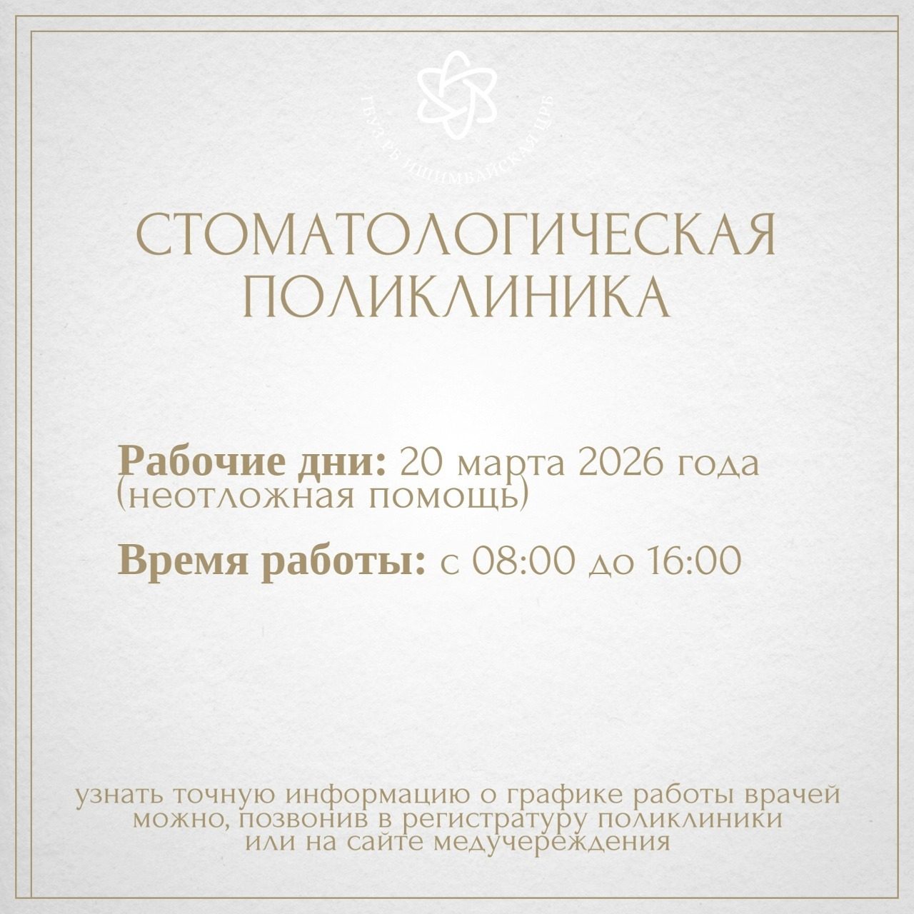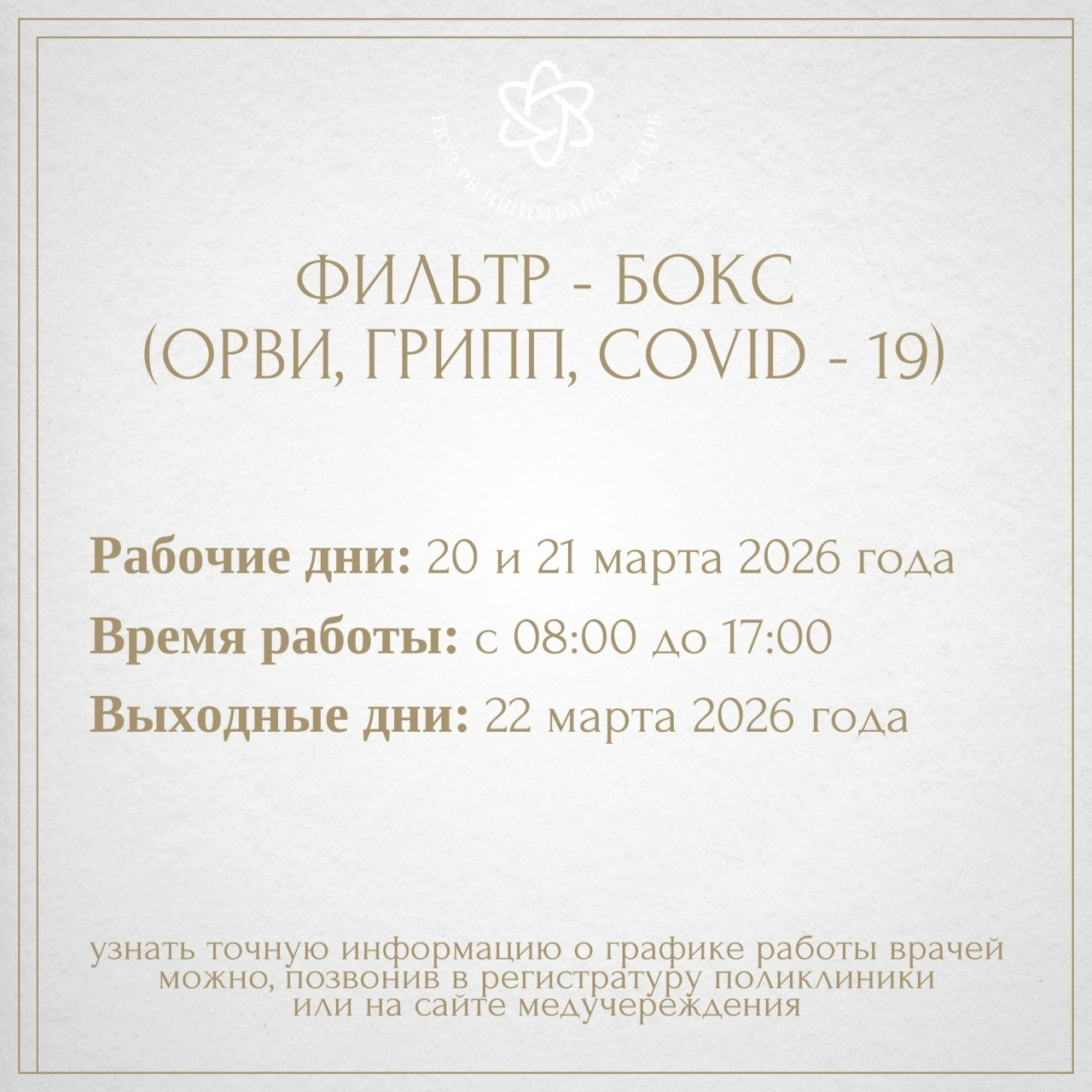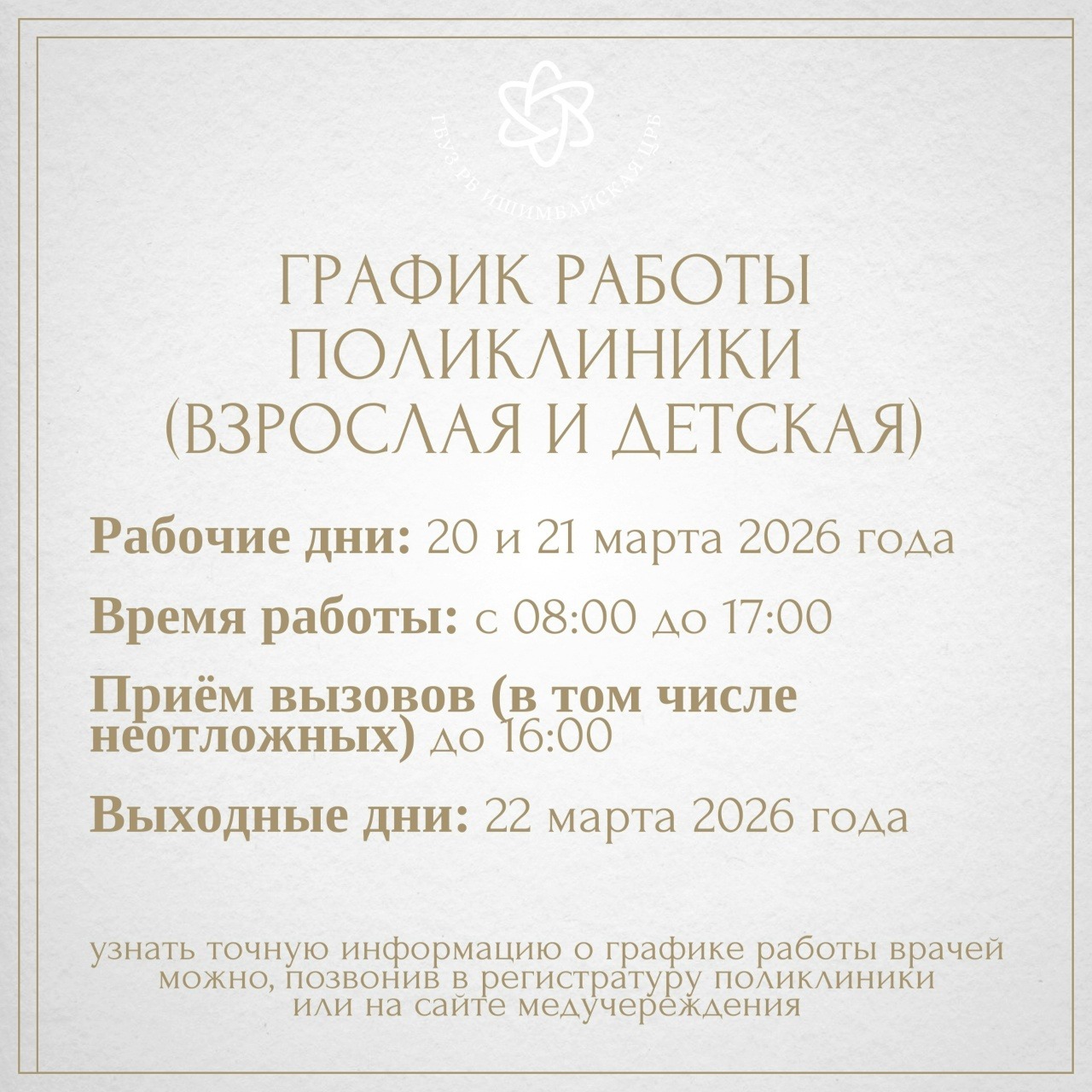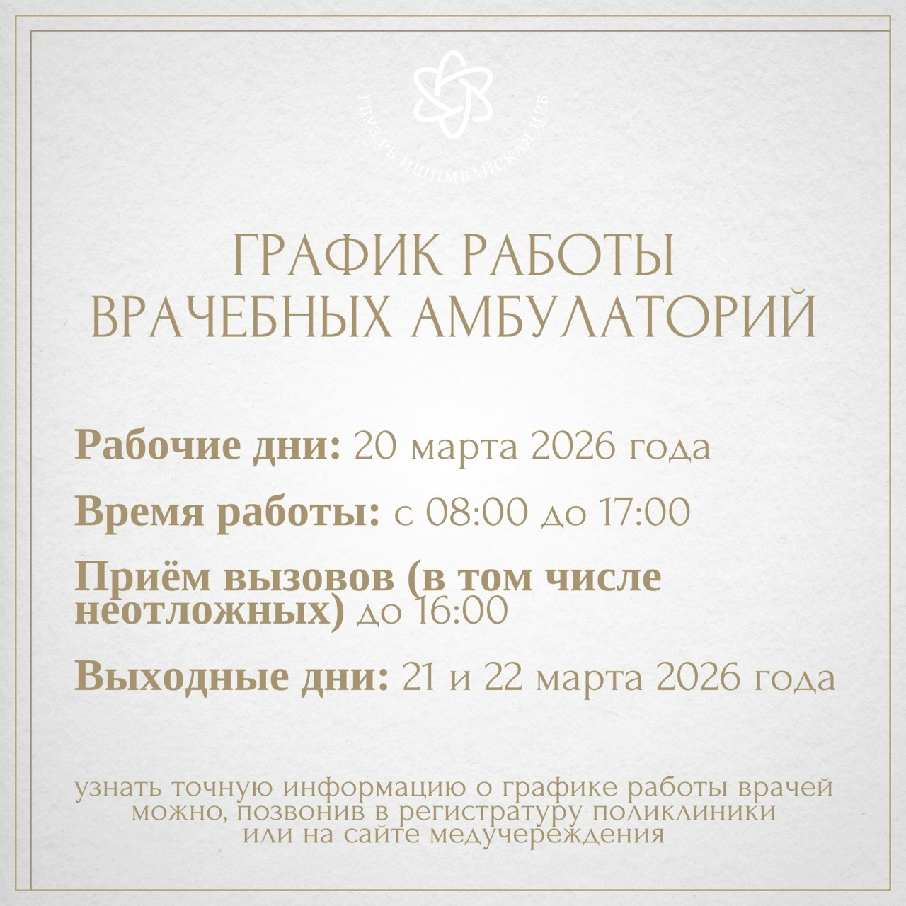Чтобы жители знали, куда обращаться в случае необходимости, медучреждение опубликовало подробный график работы на праздничные дни. Всё расписано по часам и отделениям – информация собрана в удобных карточках.