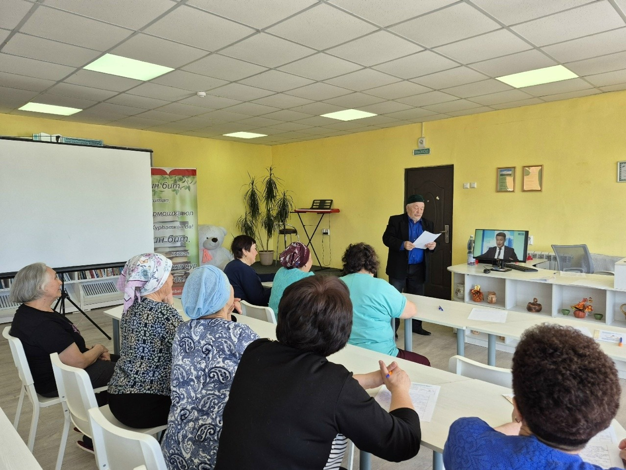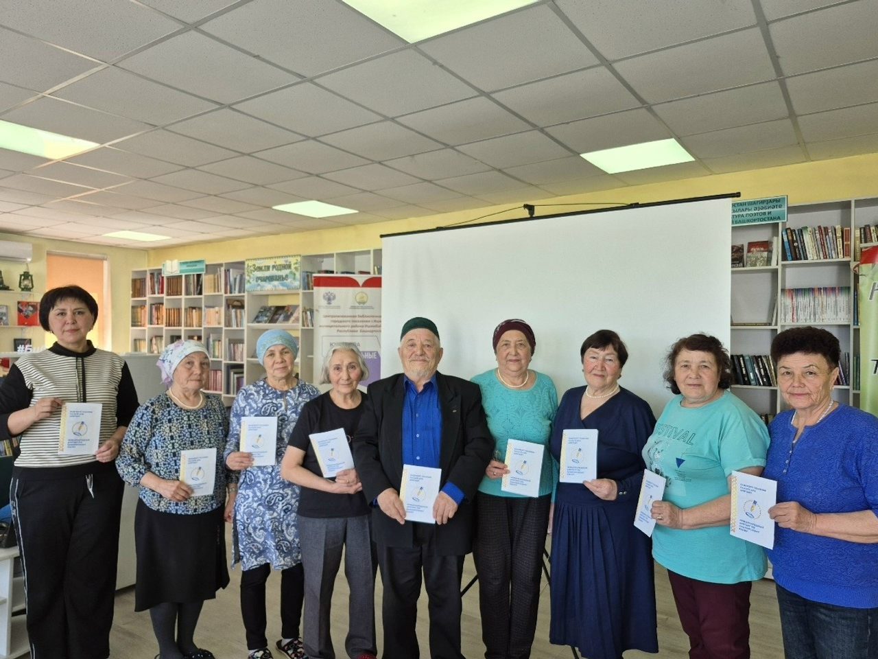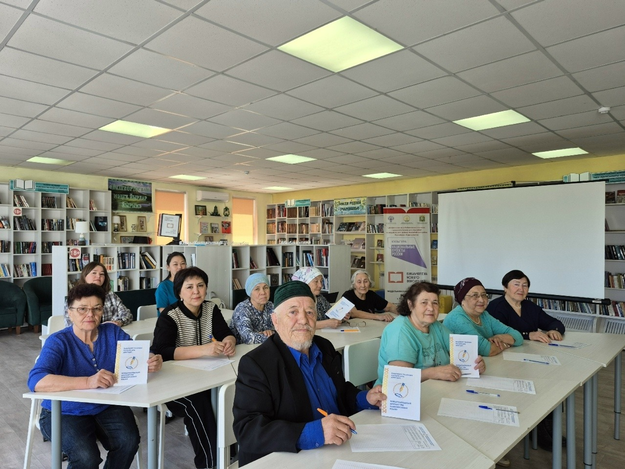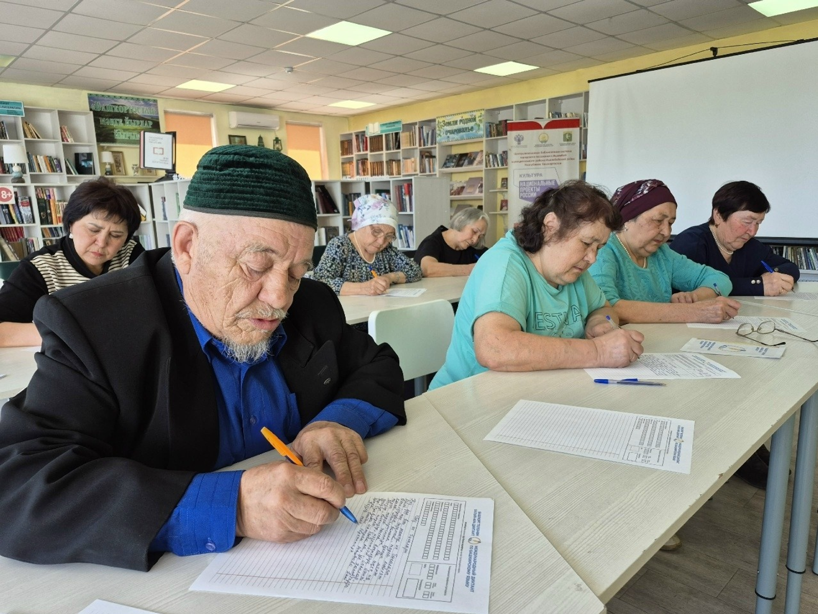 Диктант писали читатели библиотеки. Самому старшему из них Рамазану Калимуллину исполнилось 78 лет. Он не просто выполнил задание, а написал стихотворение, посвящённое башкирскому языку.