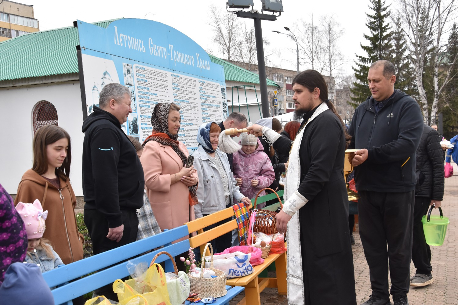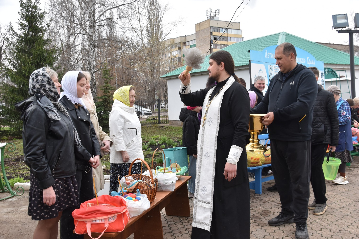 Православные ишимбайцы приходили друг за другом к храму, расставляли на скамьях блюда, приготовленные к праздничному столу, а священники окропляли святой водой яства и самих прихожан.
